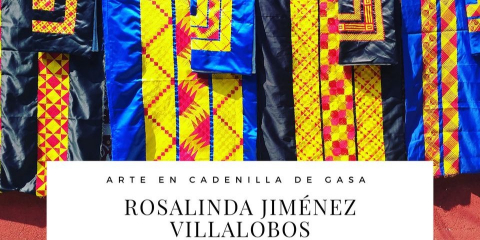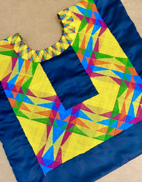 El Huipil de tehuana será en la variante y técnica de costura en cadenilla de gasa. Trazado en idiosincracia zapoteca, Bego (peine)en tela azul marino con hilos de seda en color amarillo oro en su mayoría y blanco, fucsia, azul turquesa, naranja y violeta. Huipil elaborado por Rosalinda Jiménez Villalobos, arte en cadenilla de gasa.